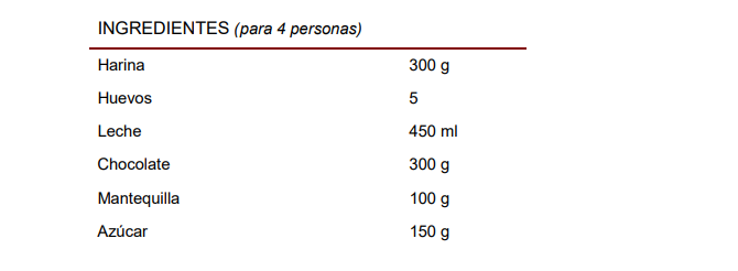 Pues bien, la receta nos indica que por cada 300 g de harina que empleemos, serán necesarios 5 huevos, 450 ml de leches, 300 g de chocolate, etc. Todo ello para obtener 4 porciones de tarta. Así, si queremos hacer tarta suficiente para 8 personas, debemos duplicar la cantidad de cada uno de los ingredientes. La relación entre las cantidades de ingredientes usados y las porciones de tarta obtenidas vendría a ser la “estequiometría” de la receta.