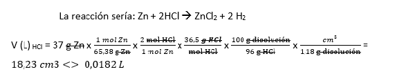 Por ejemplo, calcula el volumen de disolución de HCl al 96% de riqueza y de densidad 1,18 g/cm3 para disolver 37 g de Zn.